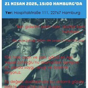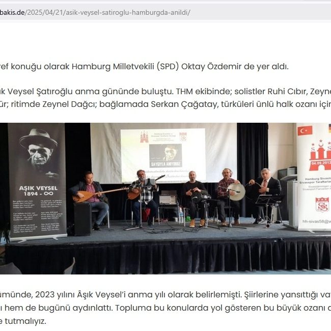 Bei der Gedenkveranstaltung „Âşık Veysel’i Anma Günü“ am 21. April 2025 in Hamburg habe ich als Musiker und Unterstützer ein kulturelles Programm mitgestaltet, das die BesucherInnen durch Musik, Poesie und traditionelle Elemente tief berührte.