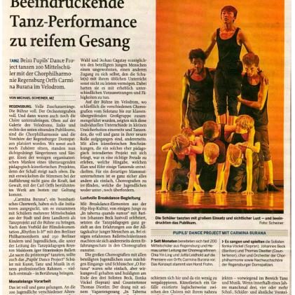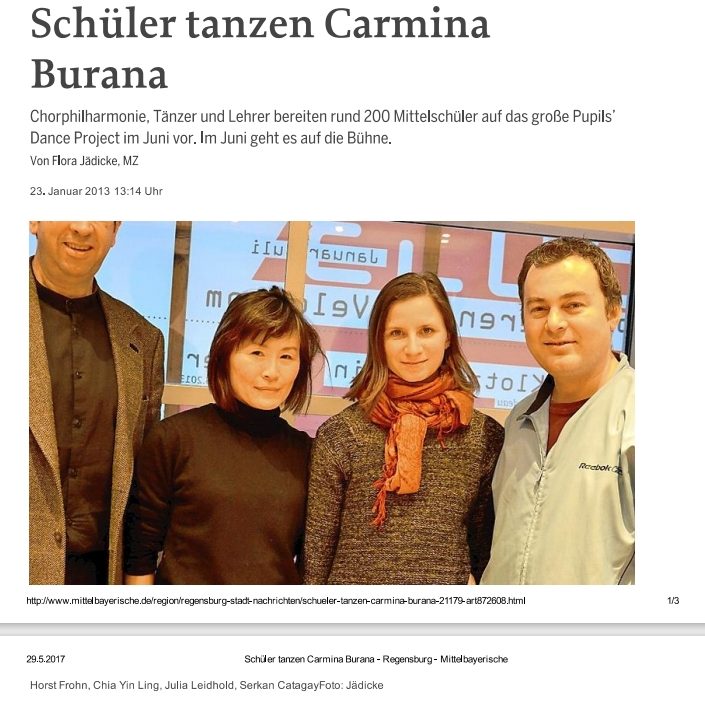 Im Rahmen des Tanzprojekts „Schüler tanzen Carmina Burana“ in Regensburg habe ich als Tanzpädagoge mit rund 200 Mittelschülerinnen gearbeitet und gemeinsam mit Chor, Philharmonie Orchester und Lehrkräften ein interdisziplinäres Bühnenprogramm entwickelt. Das Projekt wurde musikalisch von der Chorphilharmonie Regensburg unter der Leitung von Juan de Velder begleitet und in der Mittelbayerischen Zeitung als „beeindruckende Tanz-Performance zu reifem Gesang“ gewürdigt. Die choreografische Arbeit lag in meiner Verantwortung – ich habe die Schülerinnen tänzerisch angeleitet, ihre Ausdruckskraft gefördert und sie auf die Bühne vorbereitet. Dieses kreative und ganzheitliche Arbeiten prägt auch meinen schulischen Unterricht.