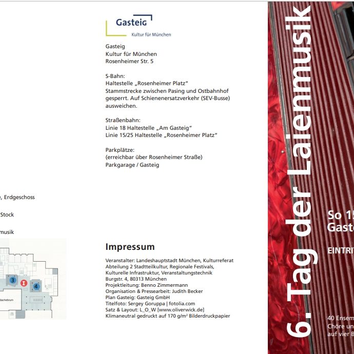 Beim „Tag der Laienmusik 2012“ im Gasteig München habe ich mit meinem Ensemble ein musikalisches Bühnenprogramm gestaltet, das im Rahmen einer AG Kindern und Jugendlichen die Möglichkeit bot, ihre Talente öffentlich zu präsentieren und Selbstvertrauen durch Musik zu entwickeln.
