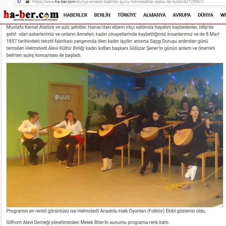 In den Jahren 2019 und 2020 habe ich im Rahmen mehrerer interkultureller Veranstaltungen in Helmstedt und Umgebung – darunter der Weltfrauentag und das Fest der Frauensolidarität – als Musikpädagoge und Projektleiter mit meiner Saz-Musikgruppe sowie einer Tanzgruppe ein Bühnenprogramm gestaltet, das kulturelle Identität, Gleichberechtigung und gesellschaftliche Teilhabe thematisierte. Die musikalischen Beiträge und Tanzperformances fanden unter anderem im Alevi Kulturzentrum Helmstedt statt und wurden von lokalen Medien als Ausdruck von Respekt, Vielfalt und Zusammenhalt gewürdigt. Durch die kreative Arbeit mit Kindern, Jugendlichen und Erwachsenen konnte ich kulturelle Werte vermitteln, emotionale Ausdruckskraft fördern und einen Raum für Begegnung und Gemeinschaft schaffen – Kompetenzen, die ich aktiv in den schulischen Alltag integriere.